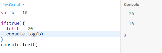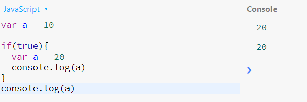 - var의 문제점(블록스코프 안에서 선언된 함수가 밖에서도 20으로 표시된다)