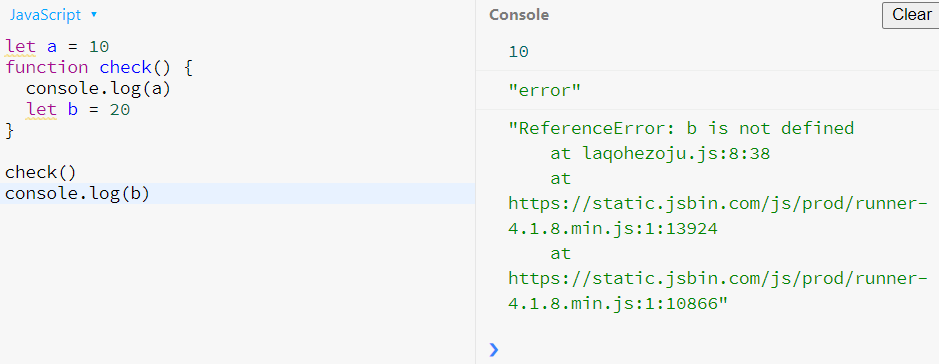 지역변수 let,const로 변수 지정 시에는 그 블록이나 펑션 밖에서는 호출이 불가하다.