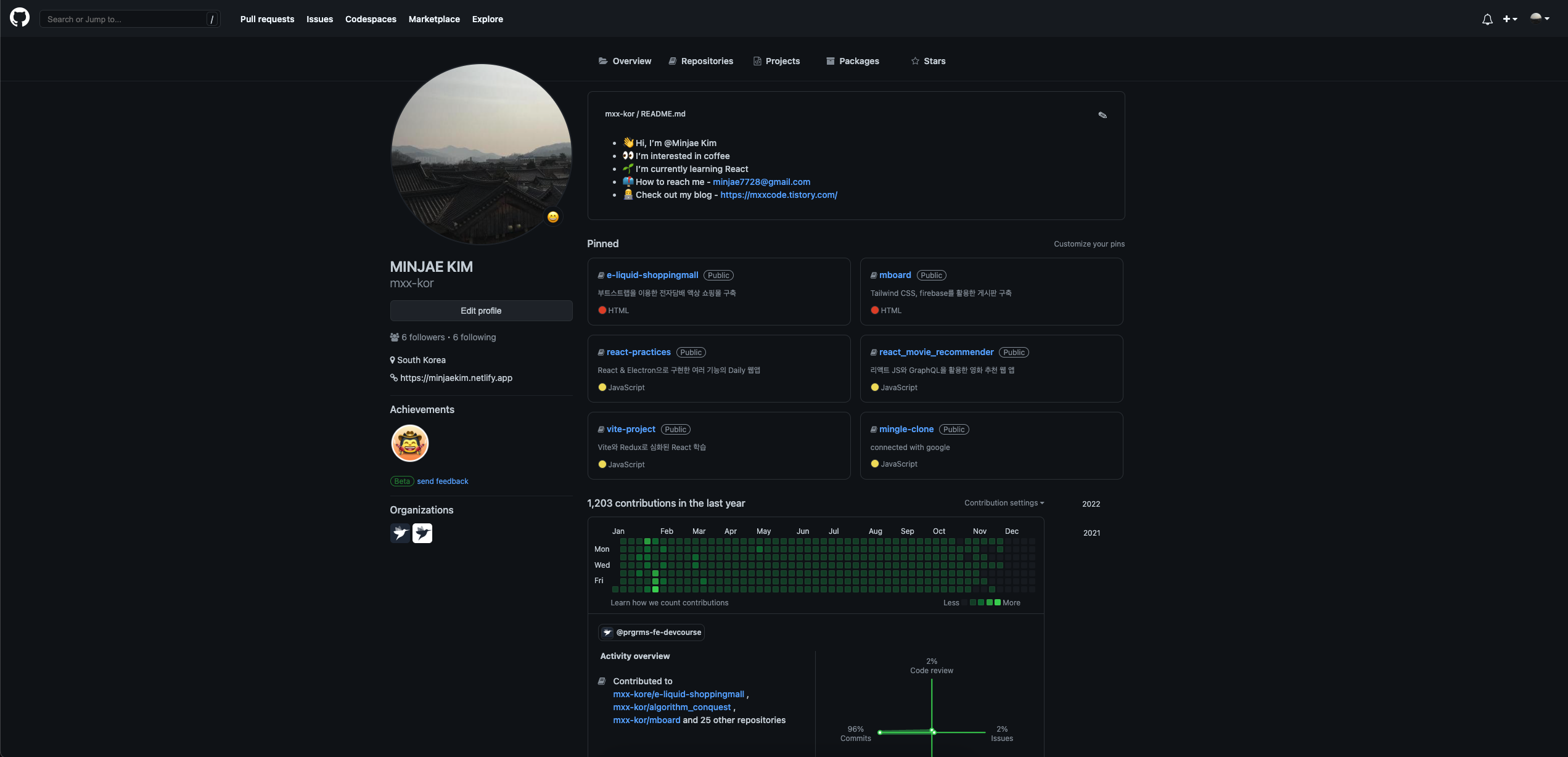 강의를 진행해 주신 강사님의 세션에서 저는 어떤 UI가 가장 클론 연습에 좋을까에 대한 질문을 했고 이에 대한 답변으로 깃헙 마이 페이지가 좋을 것 같다는 의견을 듣고 SASS로 SCSS 문법을 활용하여 진행하였습니다.
