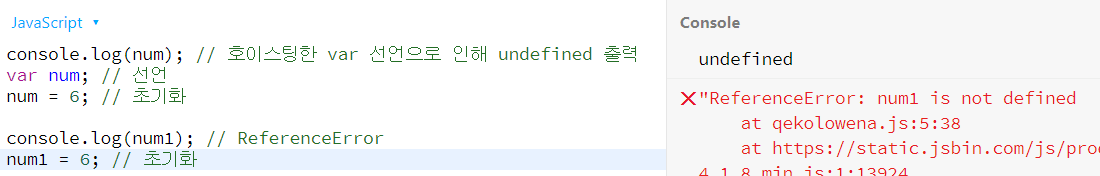 예제 2와 같이 JavaScript는 초기화를 제외한 선언만 호이스팅한다. 변수를 먼저 사용하고 그 후에 선언 및 초기화가 나타나면, 사용하는 시점의 변수는 기본 초기화 상태(var 선언 시 undefined, 그 외에는 초기화하지 않음)입니다.