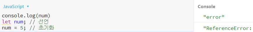 - let과 const로 선언한 변수도 호이스팅 대상이지만, var와 달리 호이스팅 시 undefined로 변수를 초기화하지는 않는다. 따라서 변수의 초기화를 수행하기 전에 읽는 코드가 먼저 나타나면 예외가 발생한다.