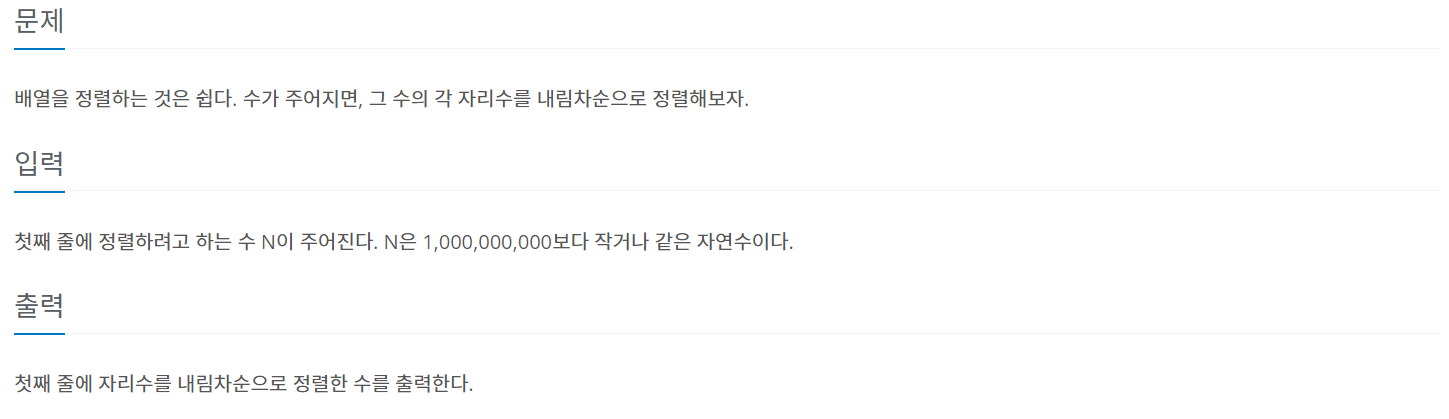 어렵지 않은 난이도의 알고리즘 문제였다. 이 문제에서는 내림차순으로 정렬하고 띄어쓰기 없이 출력하는 방법을 안다면 쉽게 해결할 수 있다. 시간이나 메모리에 대한 제약도 크지 않았다.