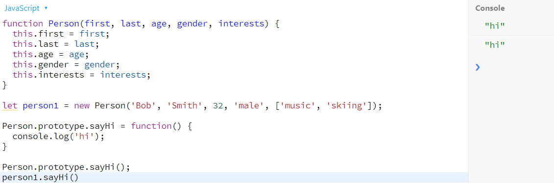 - 아래와 같이 자식 객체에 따로 함수를 지정하지 않았지만 hi를 출력한다.
