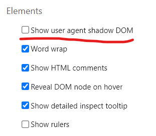 Shadow DOM을 확인하는 방법은 간단한데 개발자툴을 열어서 설정에 Shadow DOM을 보여주는 설정에 체크하면 된다.
