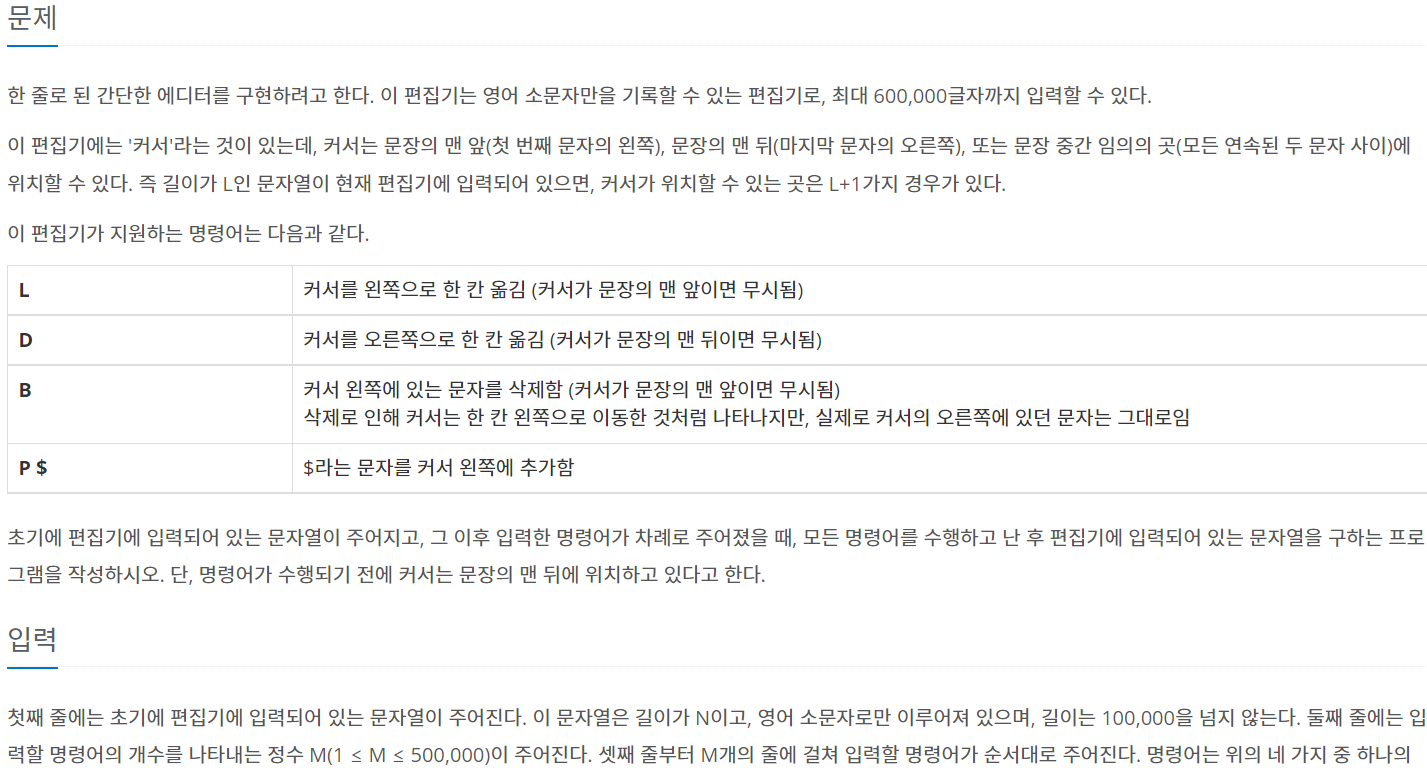 이번 문제는 (자료 구조, 스택, 연결 리스트) 알고리즘 문제로 문제의 내용은 단순히 편집기의 역할을 구현하는 것이었으나 커서를 이동하고 새로운 자료들을 추가하는 방법에 대해 찾기 위해 다른 분들의 코드를 참조했다.