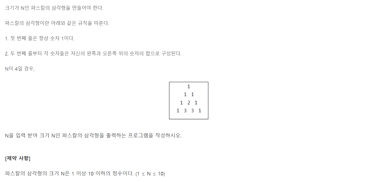 SWEA라는 사이트를 알게 되고 처음 푼 문제로 파스칼의 삼각형을 만드는 문제로 난도가 높지는 않았지만 제출할 때 #1... #2... 이런 식으로 출력되야해서 코드를 약간 수정했다. 이점을 주의해야겠다.