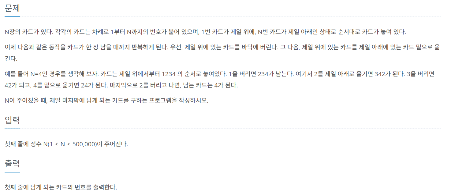 N장의 카드가 있다. 각각의 카드는 차례로 1부터 N까지의 번호가 붙어 있으며, 1번 카드가 제일 위에, N번 카드가 제일 아래인 상태로 순서대로 카드가 놓여 있다. 이제 다음과 같은 동작을 카드가