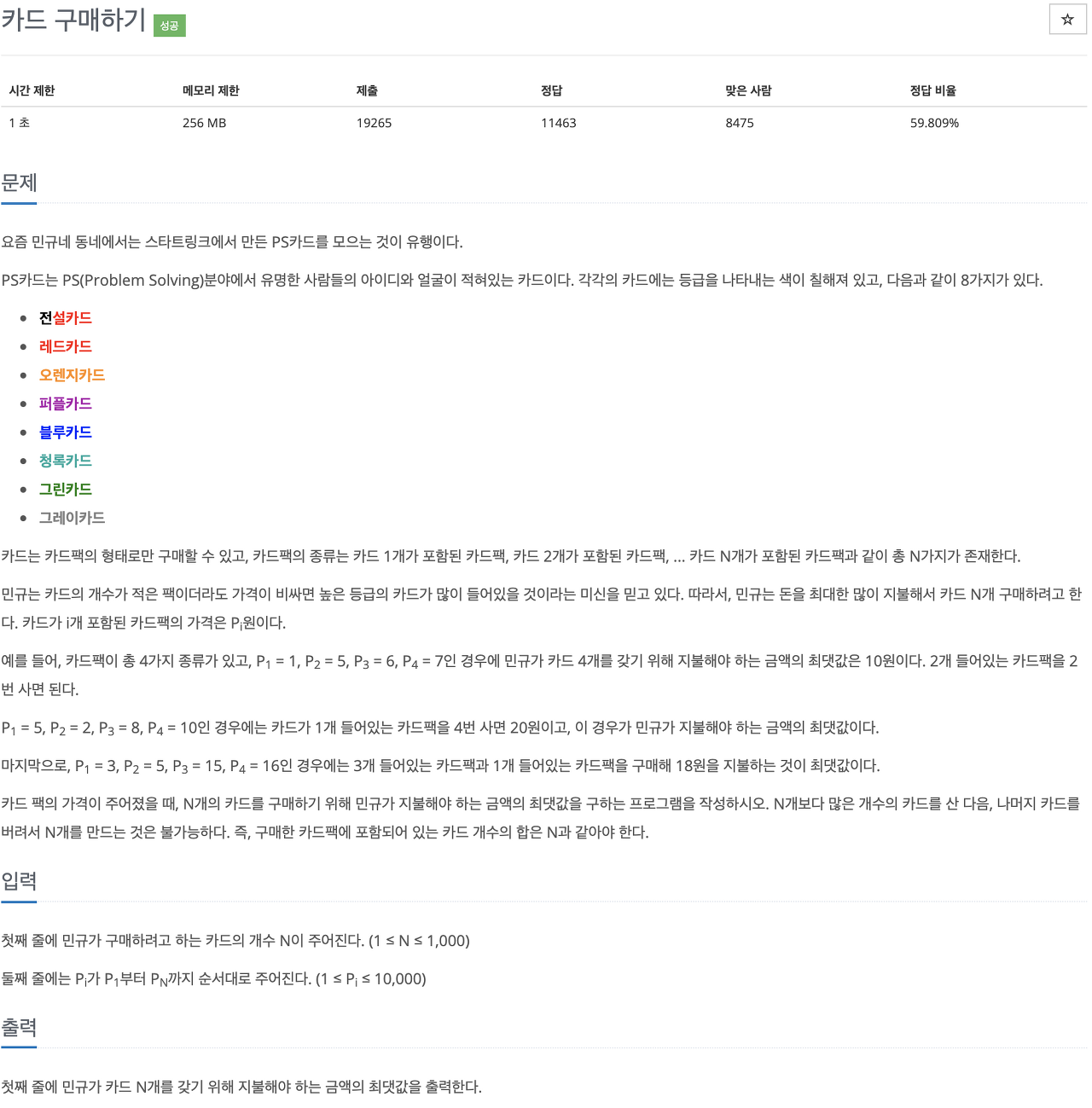 이번 문제의 핵심은 n장의 카드를 구매하는데 가장 많은 돈(최대 값)을 사용해야 한다는 점이다. 문제를 이해하는 것은 오래 걸리지 않았지만 점화식을 어떤 방식으로 만들어야 하는지 이해하는데 오래 걸렸다.