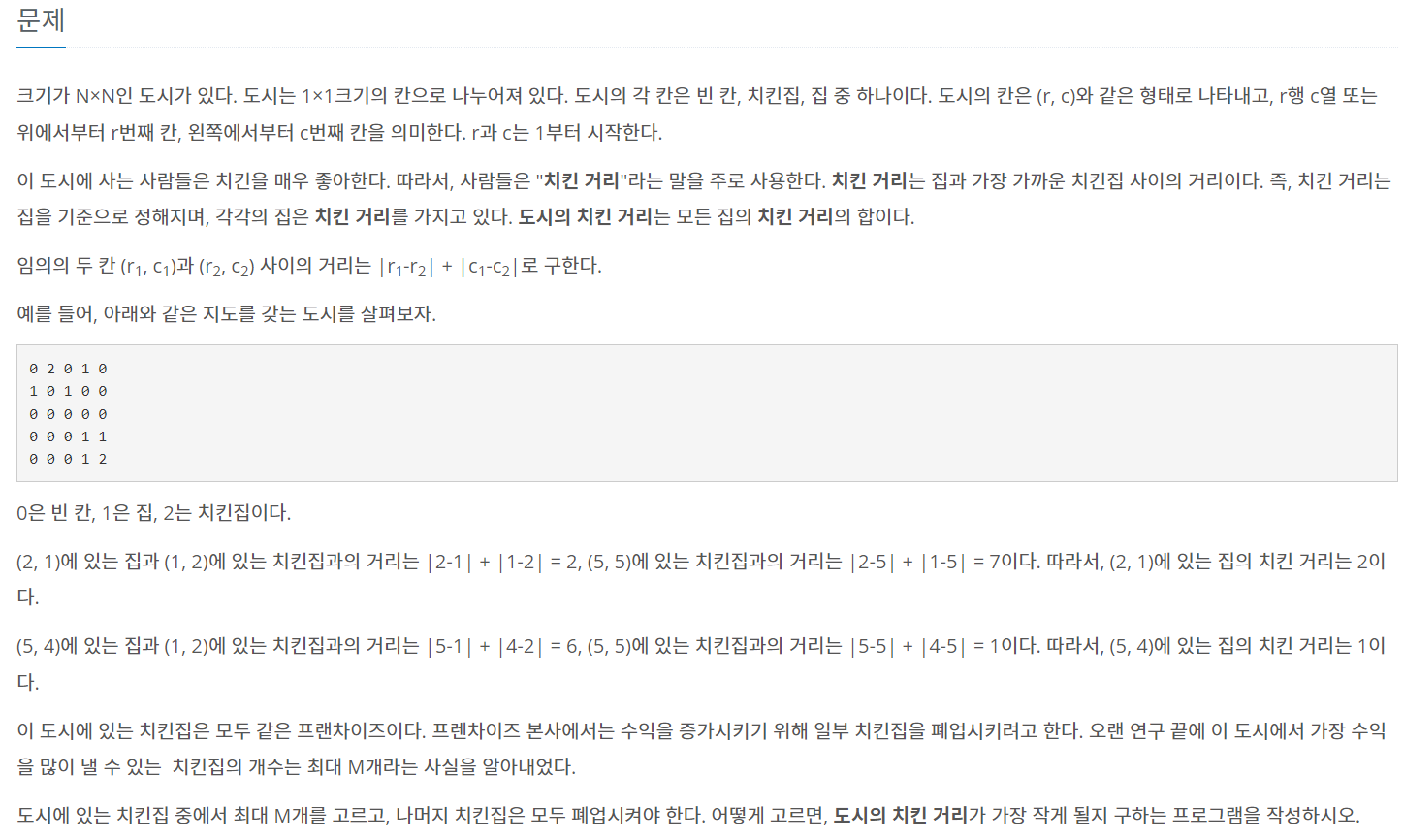 크기가 N×N인 도시가 있다. 도시는 1×1크기의 칸으로 나누어져 있다. 도시의 각 칸은 빈 칸, 치킨집, 집 중 하나이다. 도시의 칸은 (r, c)와 같은 형태로 나타내고, r행 c열 또는 위에서부터 r번째 칸