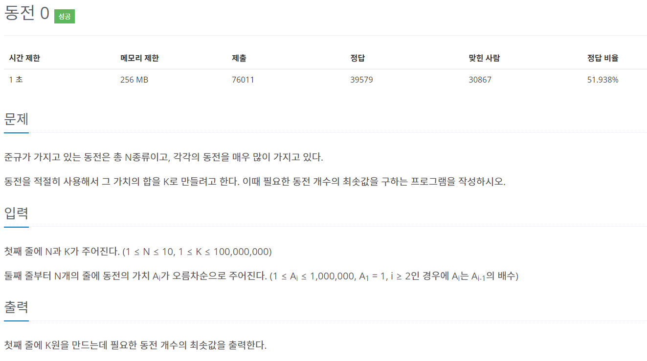 [Python] 백준 알고리즘 온라인 저지 11047 동전 0