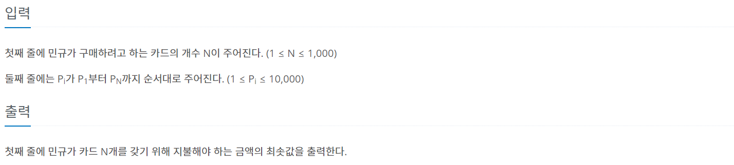 첫째 줄에 민규가 구매하려고 하는 카드의 개수 N이 주어진다. (1 ≤ N ≤ 1,000) 둘째 줄에는 Pi가 P1부터 PN까지 순서대로 주어진다. (1 ≤ Pi ≤ 10,000)