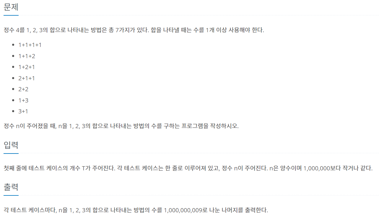 정수 n을 1, 2, 3의 합으로 표현해야 한다. 표현하는 방법이 어느 정도 규칙적인 것 같아 규칙을 찾아 풀이하기로 했다.