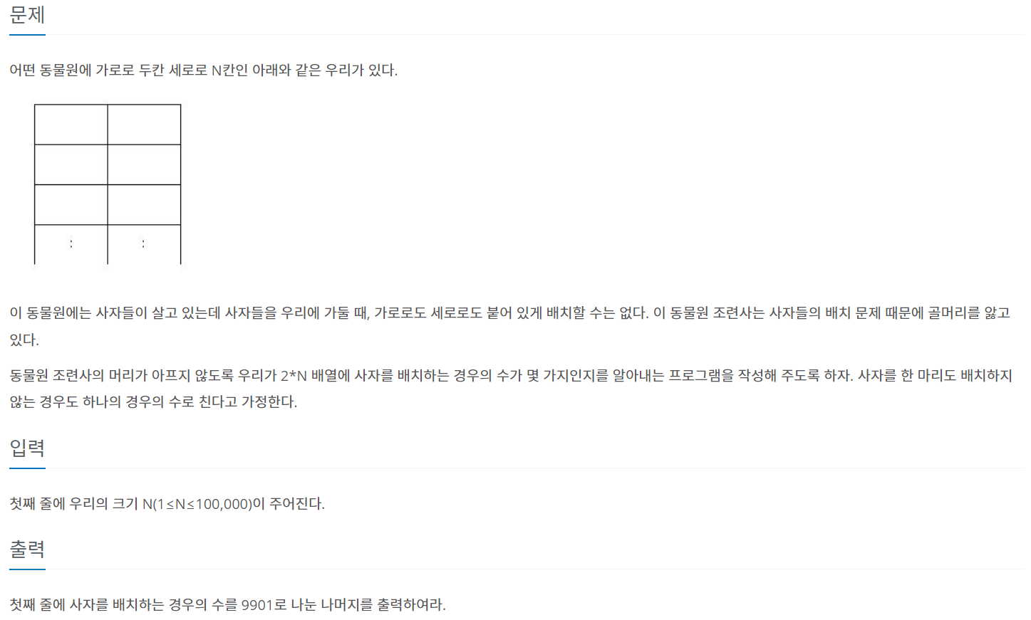 - i 번째 열에 사자가 없으면 i-1에는 사자가 없거나 왼쪽, 오른쪽 모두에 있을 수 있다.