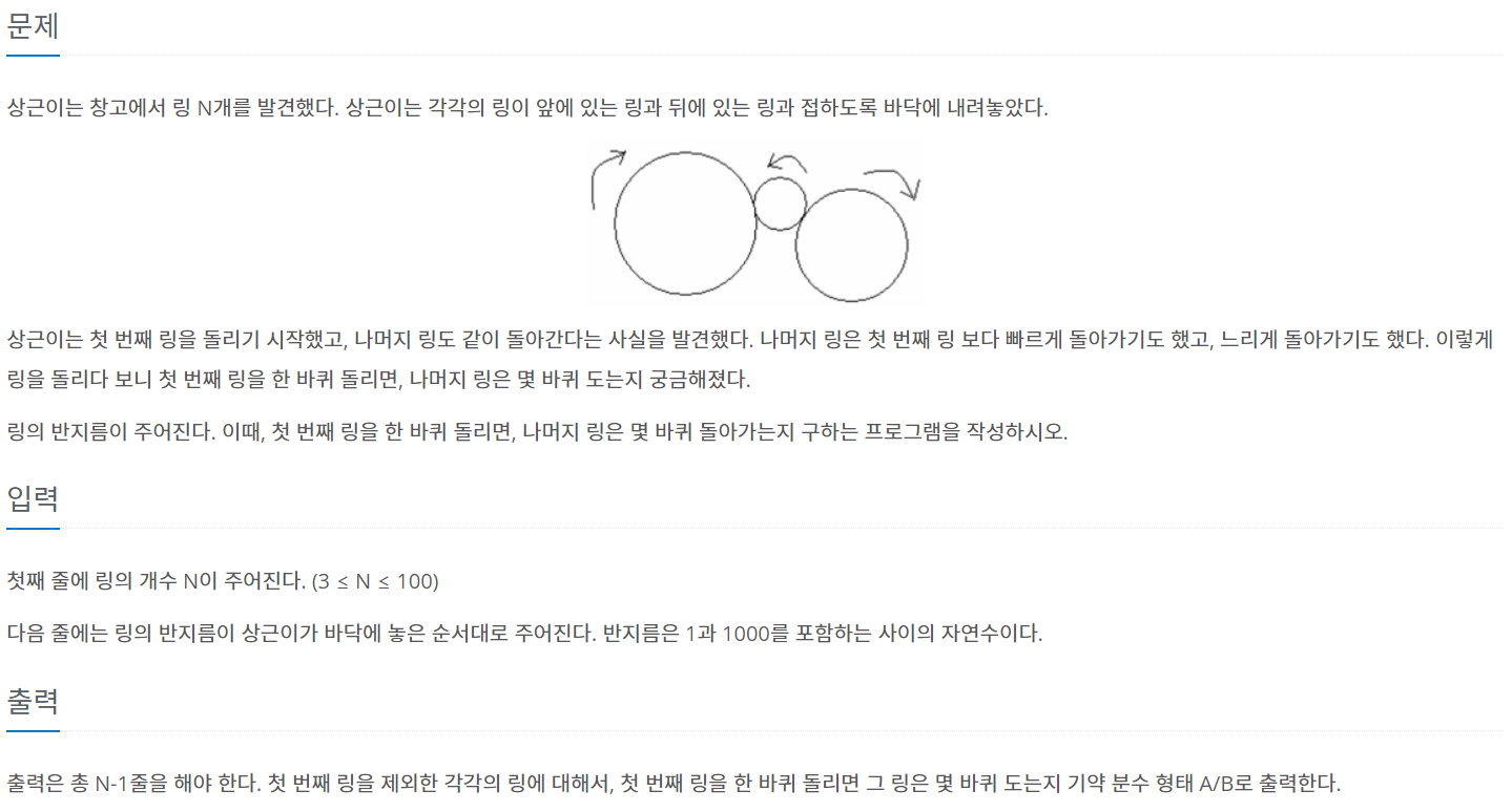 출력은 총 N-1줄을 해야 한다. 첫 번째 링을 제외한 각각의 링에 대해서, 첫 번째 링을 한 바퀴 돌리면 그 링은 몇 바퀴 도는지 기약 분수 형태 A/B로 출력한다.