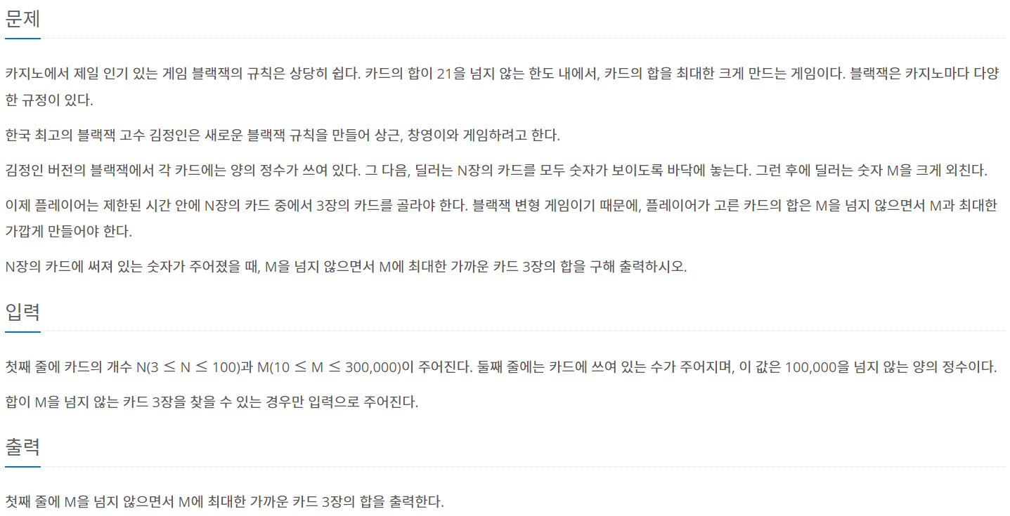 브루트 포스 단계의 문제로 3장의 카드 조합을 모두 더하고 그 값이 m에 가장 근사한 값을 출력하는 문제이다. 문제의 난이도는 쉬운 편이었다. 이 문제 같은 경우는 블랙잭 게임을 구현하는 문제와도 같아서 의사 코드를 작성 후 코드를 작성했다.